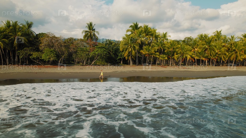 Женщина гуляет по тропическому темно-песчаному пляжу с пальмами