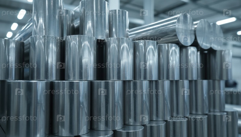 Свернутые полированные металлические цилиндры на промышленной площадке, иллюстрирующие производство высокоточных материалов и современную промышленность