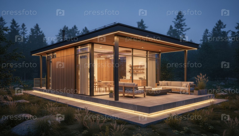 Современная каюта, освещаемая на закате, представляет собой устойчивый жилой минималистический дизайн и тенденции мирного отступления в современном стиле жизни