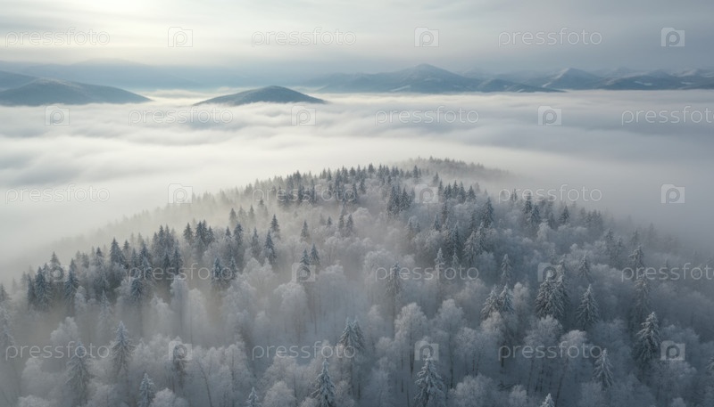 Туманный зимний ландшафт леса с морозным навесом деревьев, создавая спокойную природную сцену, подходящую для спокойного сезонного путешествия вдохновения