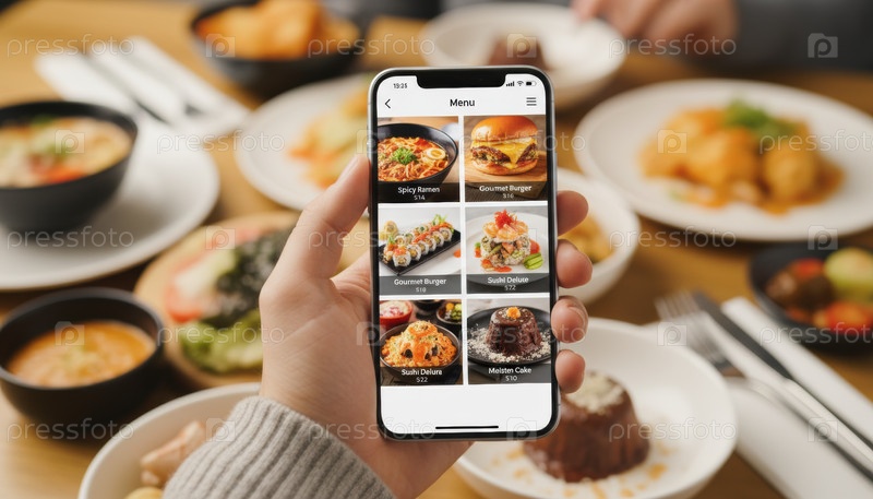 Ручной смартфон с цифровым меню ресторана среди блюд, символизирующих тенденцию доставки еды, удобный выбор и современную столовую