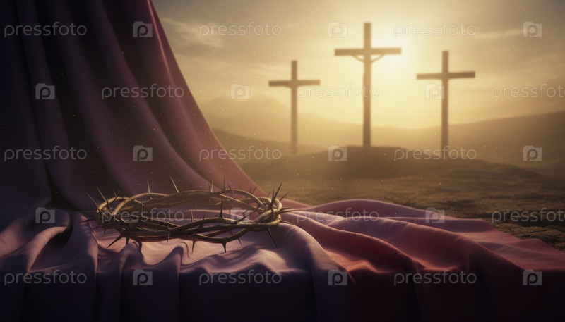Символический натюрморт с коронкой из шипов и далекими крестами на рассвете, представляющий Пасхальное христианское отражение, жертвует надеждой и значимым духовным соблюдением
