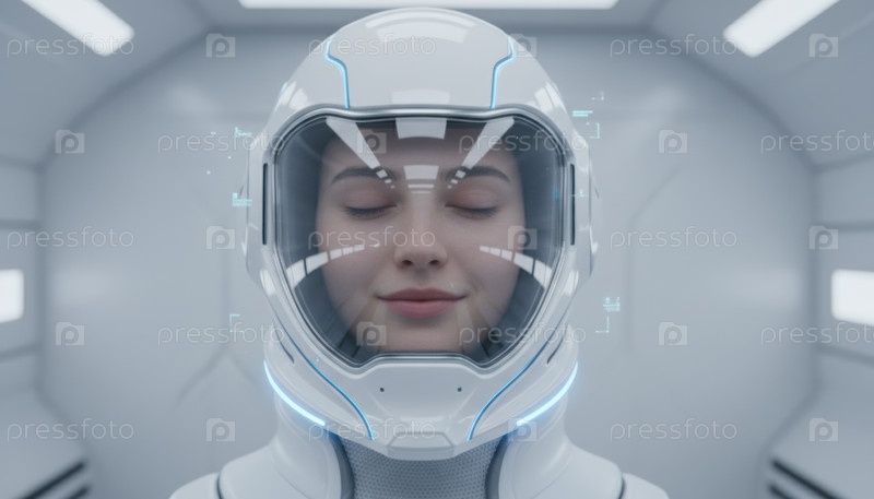 Молодой исследователь в футуристическом костюме в высокотехнологичной космической капсуле, символизирующей изучение инноваций и человеческий прогресс