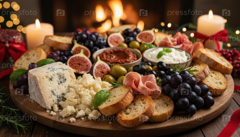 Праздник вдохновил сыр и фруктовые блюда со Средиземноморским вкусом с теплым камином, что вызвало празднование и зимнее собрание