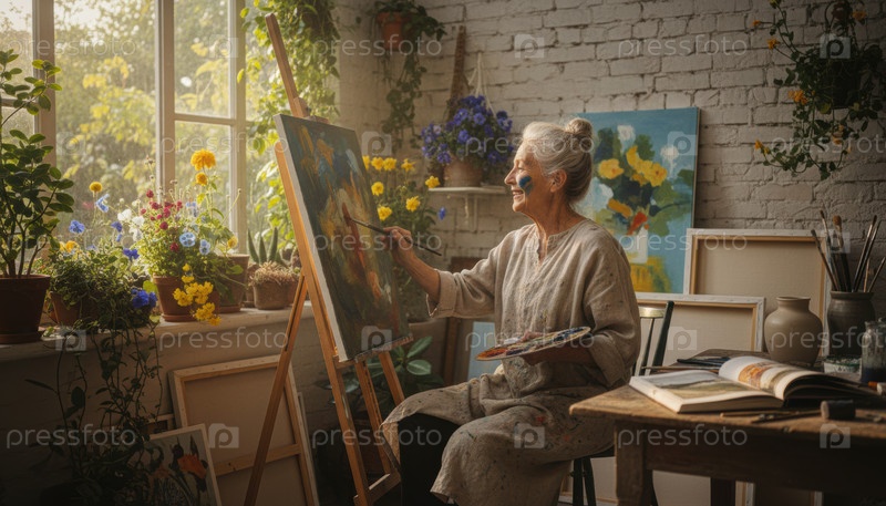 Пожилая женщина рисует в солнечной студии, наполненной цветами, изображающими творчество, спокойный художественный образ жизни и спокойное утреннее вдохновение