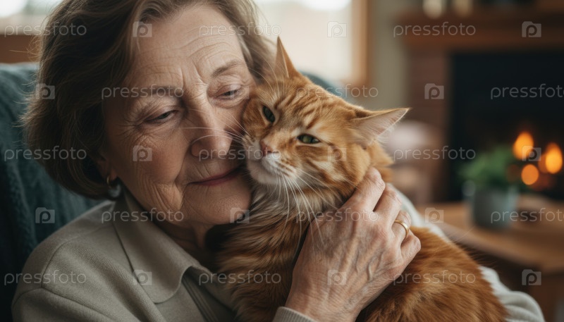 Пожилая женщина обнимает имбирного кота с теплым камином, выражая комфорт общения с домашним животным, любовь к дому и эмоциональный момент связи