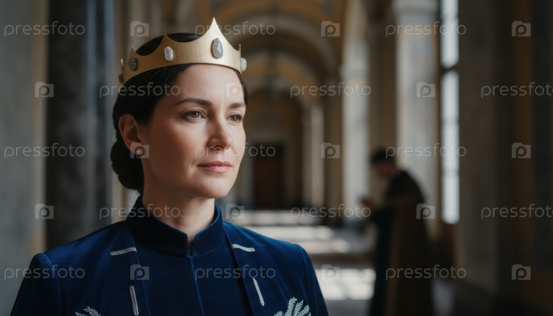 Женщина в короне в коридоре дворца олицетворяет традиционную культуру королевской семьи и исторический рассказ