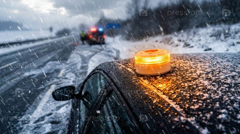 Магнитный экстренный свет высокой видимости V-16 для транспортных средств активен на крыше автомобиля, выведенного по заснеженной дороге во время зимнего снегопада с размытыми полицейскими или аварийными машинами