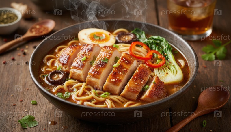 Теплая миска рамена с куриными яйцами и овощами, которая представляет собой комфортную азиатскую кухню, кулинарное ремесло зимних блюд и уютную атмосферу в ресторане