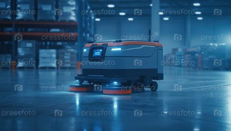 Автономный робот-чистильщик пола, работающий на складе, символизирует автоматизацию логистики и будущие технологические тенденции