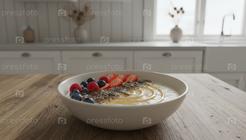 Здоровый завтрак с коктейлем со свежими ягодами и наполнением семян на деревянном столе в яркой кухне скандинавского стиля, способствующей внимательному питанию и сбалансированному образу жизни