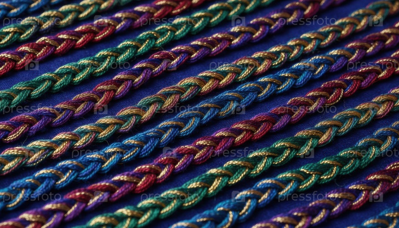 Красочные плетеновые текстильные нити, расположенные в аккуратных рядах, показывают яркие узоры ремесла