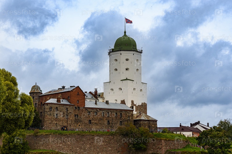 Историческая крепостная башня Выборгского замка, возвышающаяся на фоне впечатляющего неба