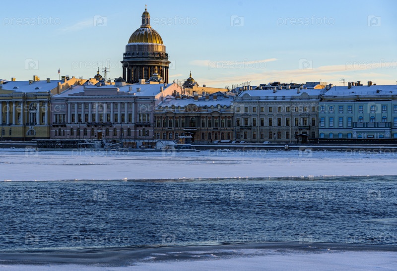 Знаменитый собор Святого Исаака с видом на замерзшую Неву зимой