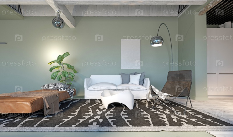 3D-рендеринг современной гостиной со зелёными сальфийскими стенами и деревянными потолочными балками.В пространстве есть белый диван, кожаная дневная кровать, кресло бабочки и рисунковый коврик.Чистое полотно на стене обеспечивает место для планировки
