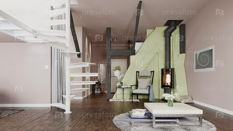 3D-рендеринг современного интерьера гостиной с белой спиральной лестницей, темными деревянными полами и современным камином со стеной зеленого акцента