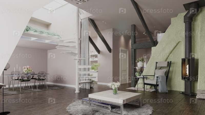 3D-версия современной открытой квартиры с спальней на чердаке, доступной по белой спиральной лестнице.Интерьер имеет темные деревянные полы, открытые балки и современную древесную плиту