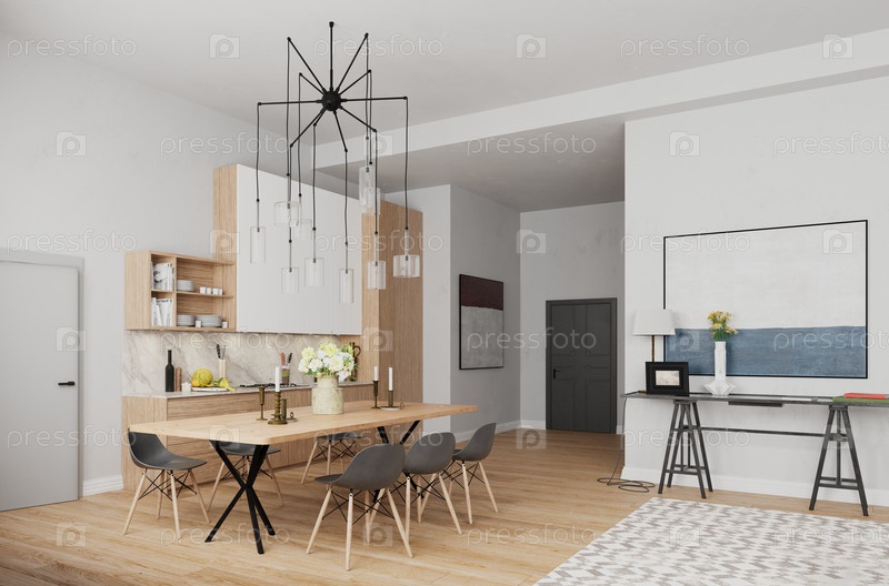 В пространстве есть деревянный стол, серые стулья и современная черная люстра