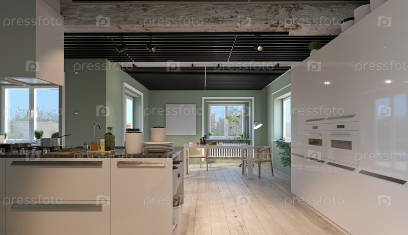 3D-версия современной кухни с белыми глянцевыми шкафами, зелеными стенами и деревянным полу