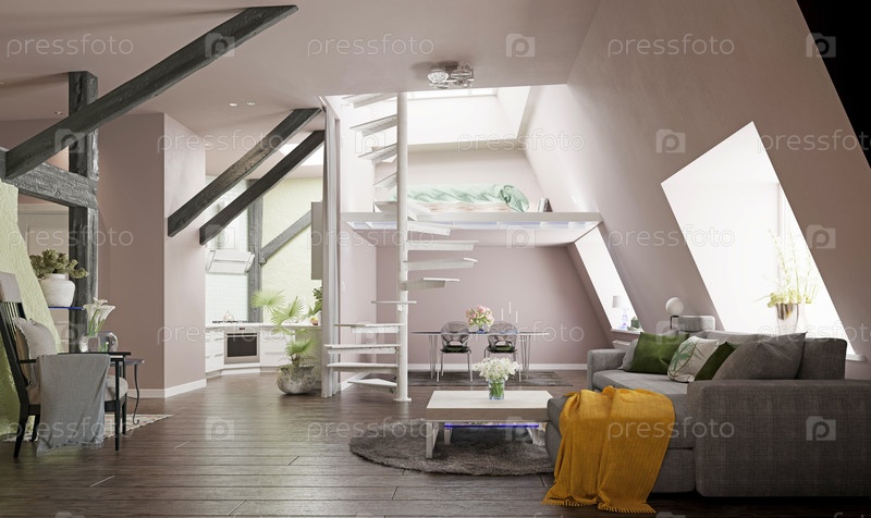 3D-рендеринг современной квартиры на чердаке с открытым планом с мезонитной спальней, спиральной лестницей и открытыми деревянными балками под наклонным потолком