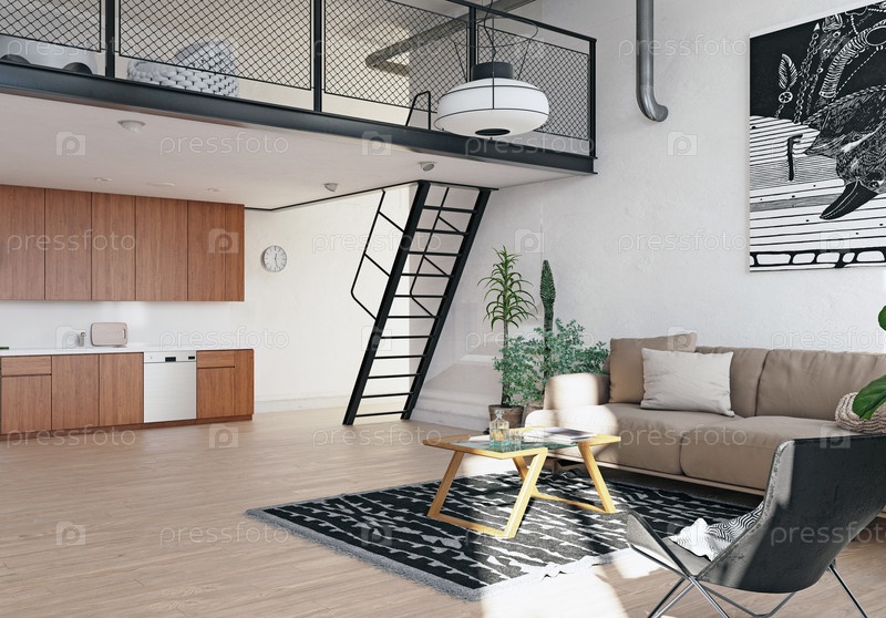 Современный интерьер кухни на чердаке.Концепция 3D-рендеринга