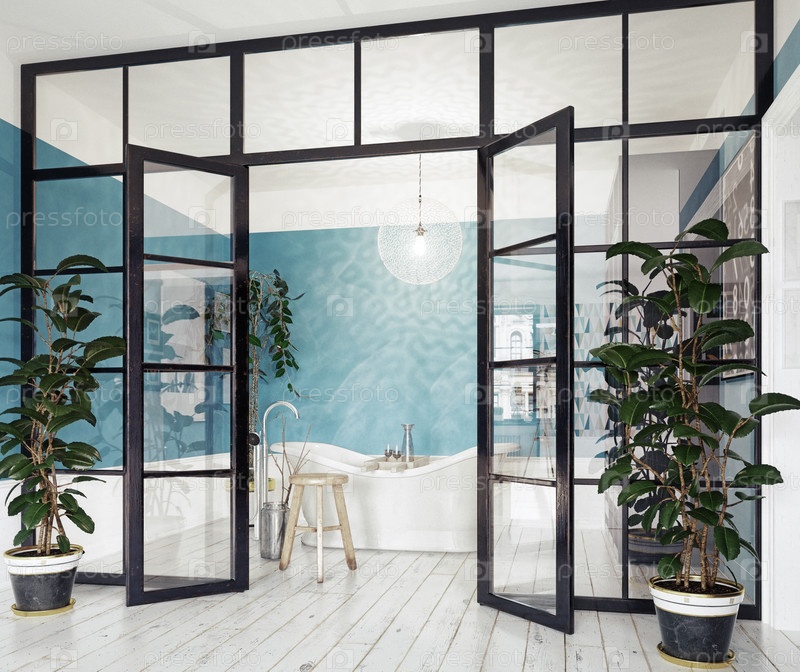 Современный интерьер ванной комнаты. стеклянная стенка 3d концепция