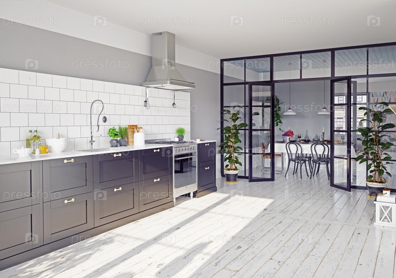 Кухонный интерьер со стеклянной перегородкой. Современная концепция 3D-рендеринга