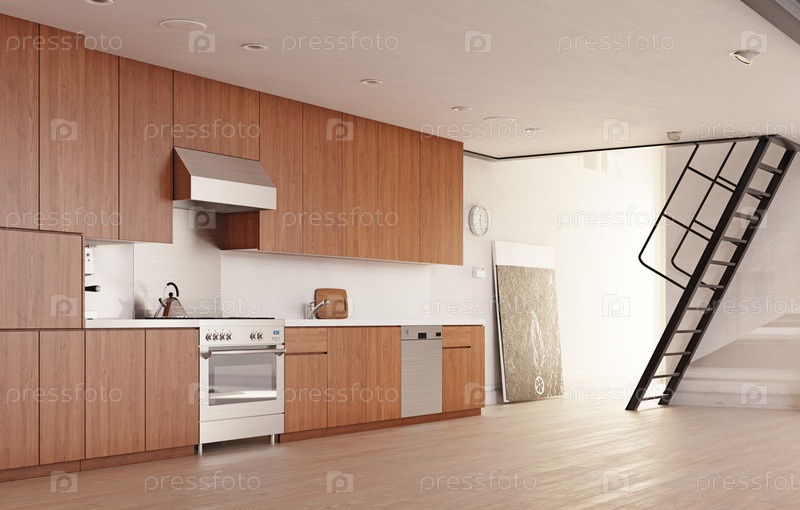 Современный интерьер кухни на чердаке.Концепция 3D-рендеринга