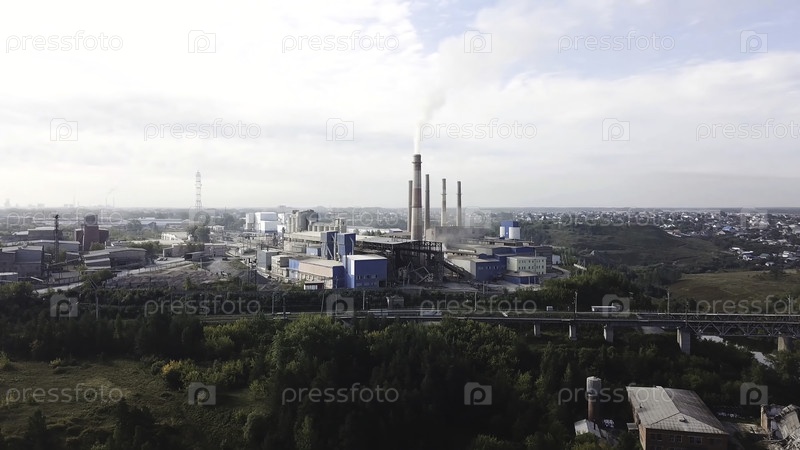 Вид с воздуха на промышленную зону с химическим заводом. Фабрика дымовых труб, расположенная недалеко от города, загрязнение воздуха и экологическая концепция