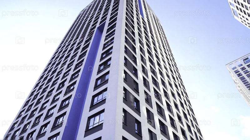 Нижний вид новых жилых многоэтажных зданий с голубым небом. Городская среда. Рамка. Новейшие жилые комплексы с экологически чистой средой