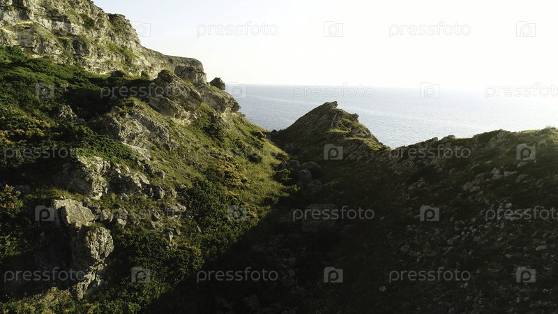 Потрясающий склон, покрытый скалами и зеленой травой над голубым морем и ярким небом, летняя природа