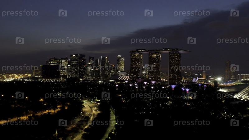 Сингапур - 25 сентября 2018: Голубой горизонт в Сингапуре ночью, Марина-Бэй Сэндс и современные здания с большим количеством огней. Съемки. Задний вид на Марина-Бей Сэндс и другие красивые здания при ночном освещении