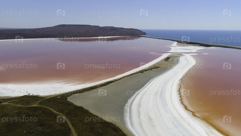 Панорамный вид из воздуха ярких цветов - это знаменитое природное место розовое озеро в Крыму с удивительной береговой линией и бирюзовым морем на фоне. Съемки. Уникальное розовое озеро со солено-белыми берегами