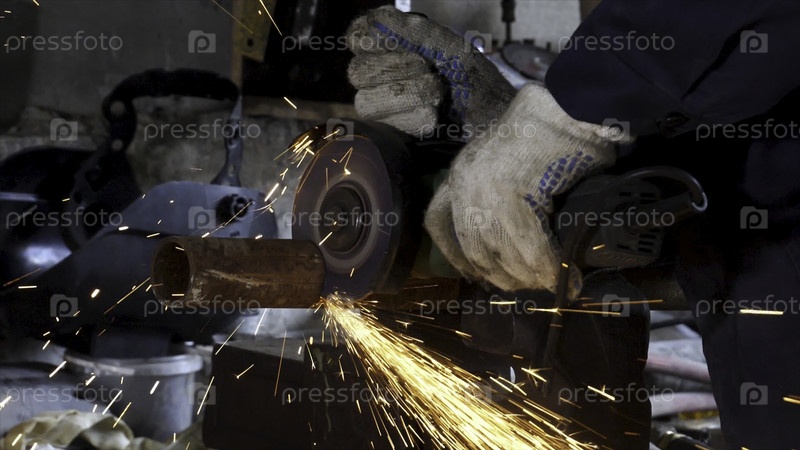 Рука мужчины отрезает кусочки водопроводной трубы с помощью угловой шлифовки.Обрезка превратилась в брызгу искр на стройплощадке.Искры при резе металлической угловой шлифовки