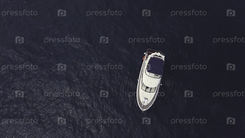 Удивительный вид яхты, плавающей в открытом море в солнечный день. Вид с высоты белой роскошной парусницы, изолированной на морской текстуре с небольшими волнами, концепция водного транспорта