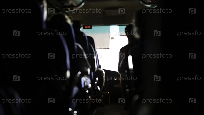 Туристы в автобусе отправляются на экскурсию. Сток. Транспорт, туризм, дорожное путешествие и концепция людей - группа счастливых пассажиров или туристов в туристическом автобусе