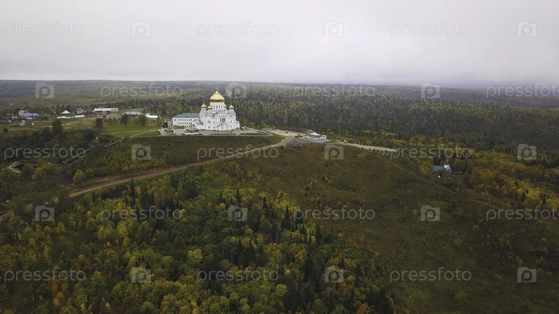 Вид с воздуха большой белой христианской церкви со золотыми куполами на холме и полем с лесным фоном