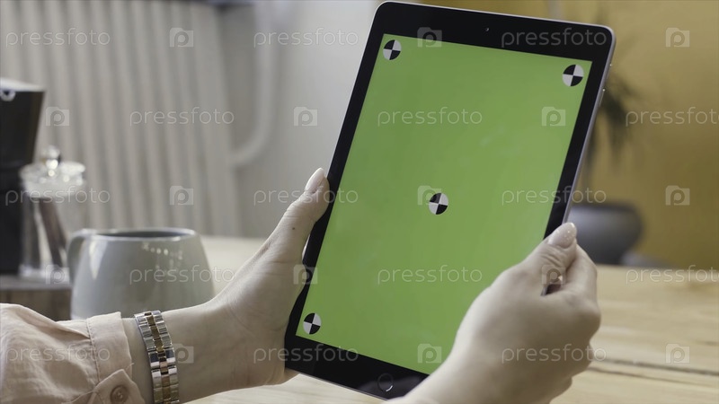 Женщина нажимает, прокручивает и масштабирует планшетный компьютер с зеленым экраном. резервные записи. Вид на плечо молодой женщины, работающей со своим устройством, хромовый ключ