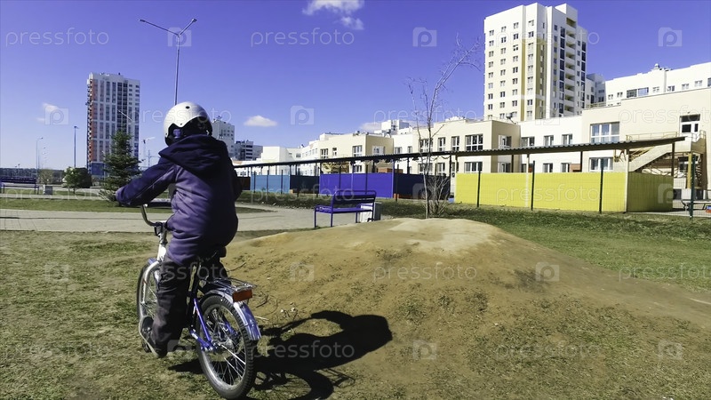 Мальчик катается на велосипеде в шлеме и оборудовании