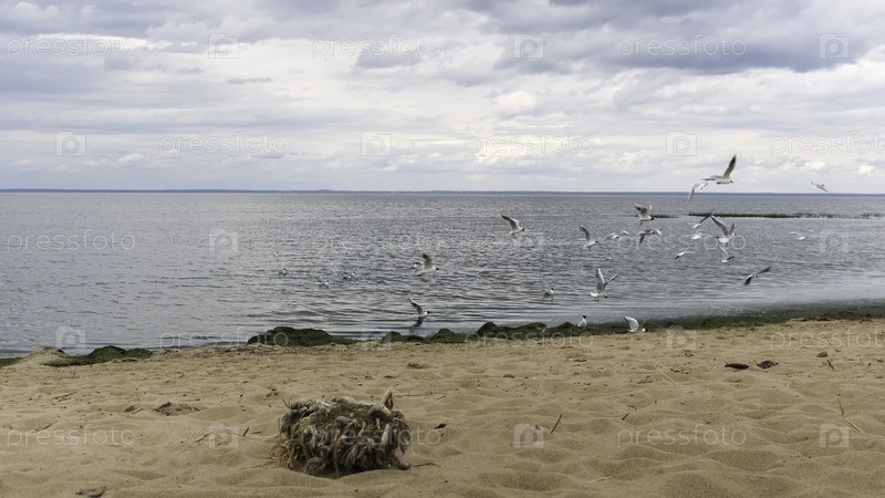 Стадо чайков на пляже в Финском заливе, Санкт-Петербург, Россия.Птицы летают над морской волной возле песчаного берега на фоне облачного неба