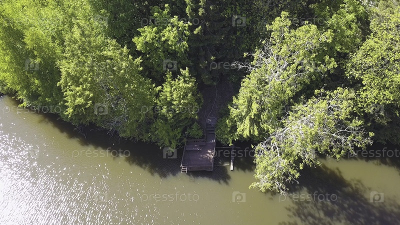 Зеленая вода, деревянный пирс и зеленые деревья, вид с летающего беспилотника. Клип. Вид сверху на прогулке среди деревьев на берегу реки в солнечный летний день