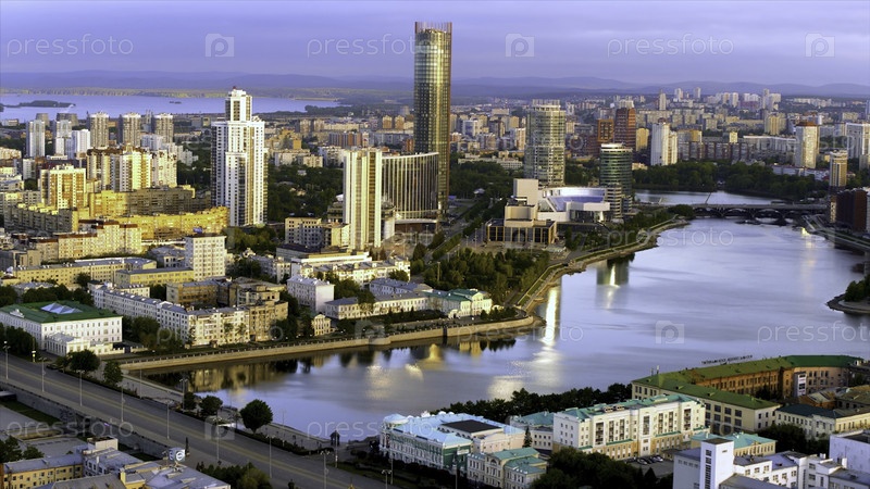 Екатеринбург, Россия, воздушный вид города с Исетинской башни и реки с набережной