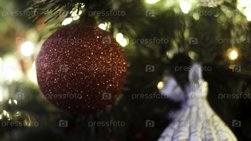 Декорированная рождественская елка на размытом, сверкающем и сказочном фоне, радостное Рождество и счастливая концепция Нового года