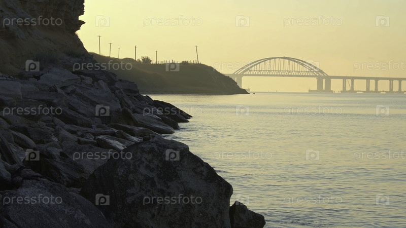 Закрывающие скалы и камни под горной скалой у воды с большим красивым белым мостом на заднем канаве против неба на рассвете.Стрельба.Удивительный утренний пейзаж