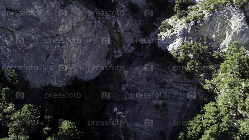 Камера уходит от лесного склона с скалами в солнечный летний день.Воздух многих зеленых пихтовых деревьев, растущих на крутом горном склоне, красивый фон