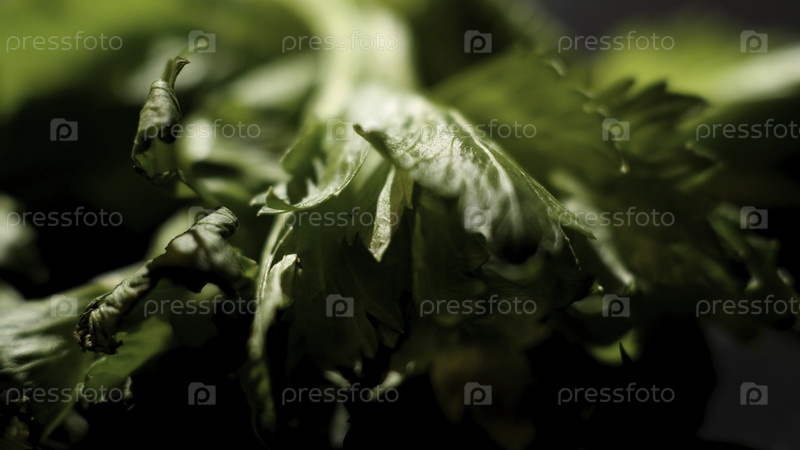 Закройте лежащие на черном столе листья кориандра, подробности процесса приготовления