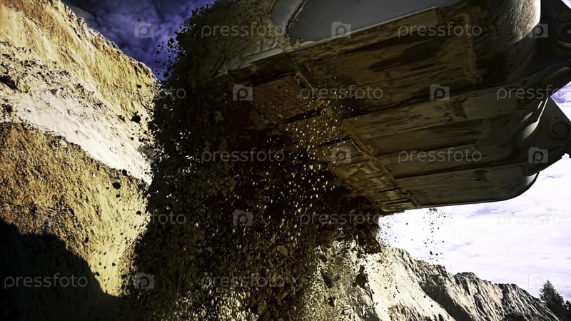 Погрузчик разгружает песок на стройплощадке Кетама. резервные кадры. снизу экскаватор переворачивает ведро земли и песка