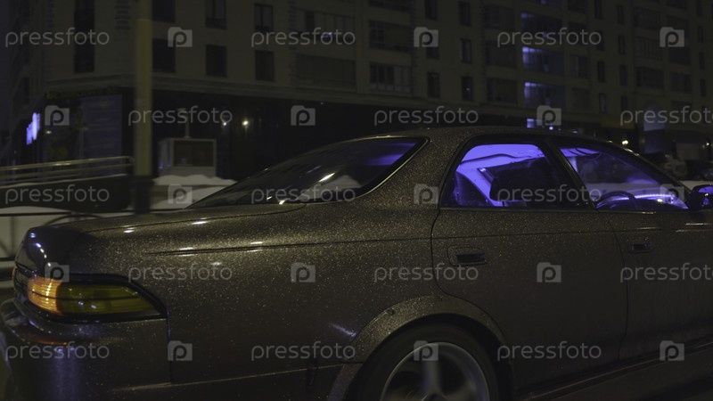Боковой вид современного автомобиля с красивым пурпурным блестящим кузовом, быстро движущегося по городу ночью