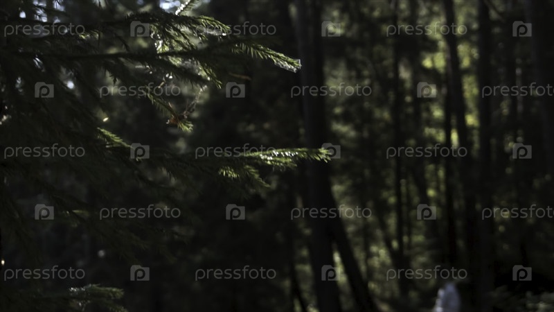 Закройте ветвь зеленой пихты, солнечный свет и человек, идущий по густому лесу. Видеозапись. Мужчина-путешественник в белом куртке проходит сквозь густое дерево в солнечный летний день