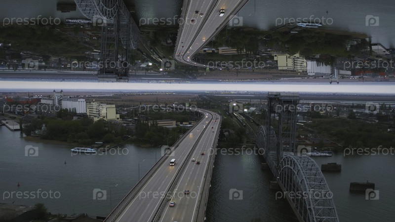 Ранним утром можно увидеть город с речным мостом, незавершенным зданием и множеством зеленых деревьев, эффект зеркального горизонта. Серое утро в городе с бирюзовой рекой, кораблями и мостом